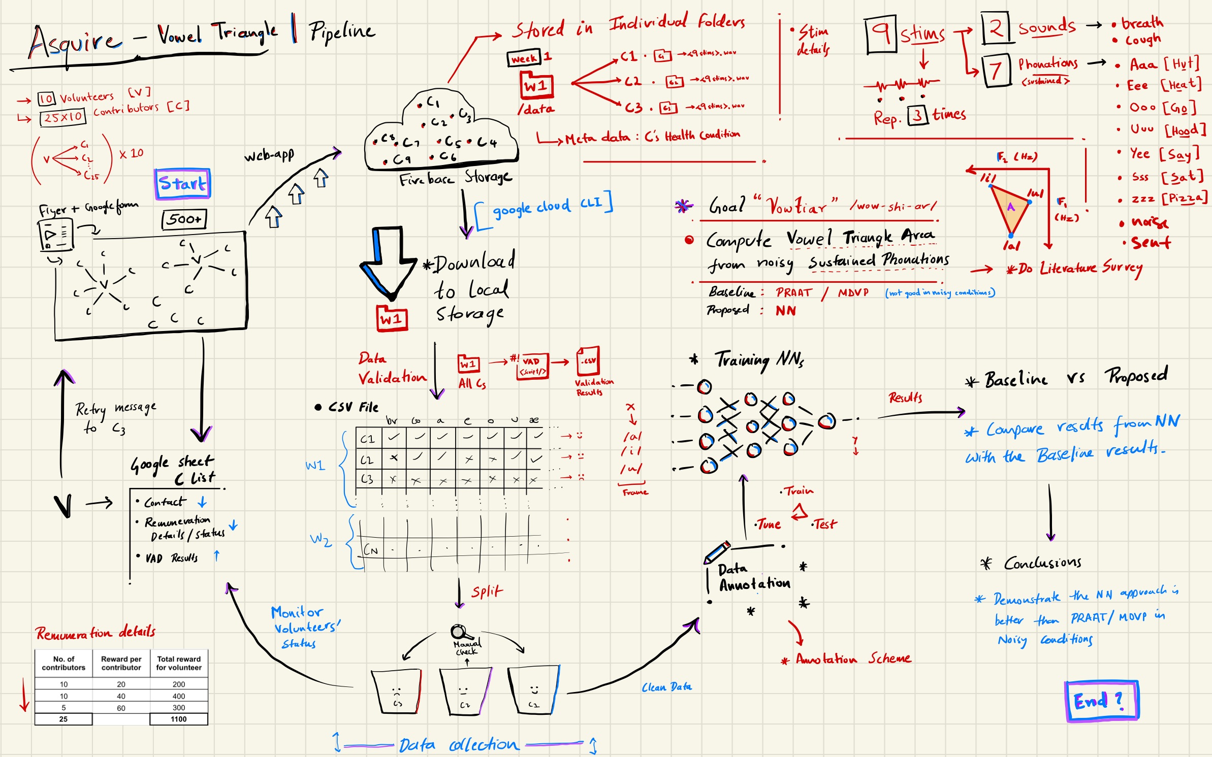 Asquire collects voice data from users through a web application. The users are instructed to perform sustained phonations, provide breath sounds, and cough sounds. The application then processes this voice data using data-driven and signal processing methods. Various sound characteristics such as frequency, intensity, duration, and patterns are extracted from the voice samples.