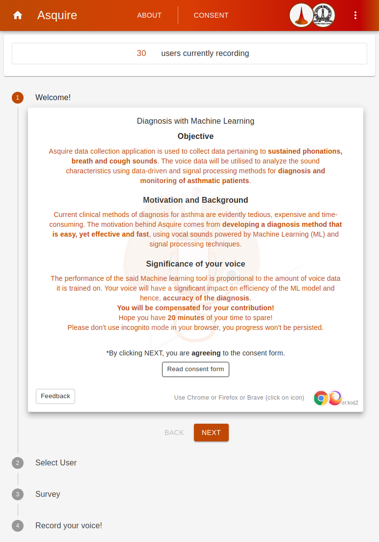 We collected around 10 hours of data from 200+ users. The data was annotated using the annotation scheme designed for asquire. The data collected is being used to develop machine learning models for asthma diagnosis and monitoring.