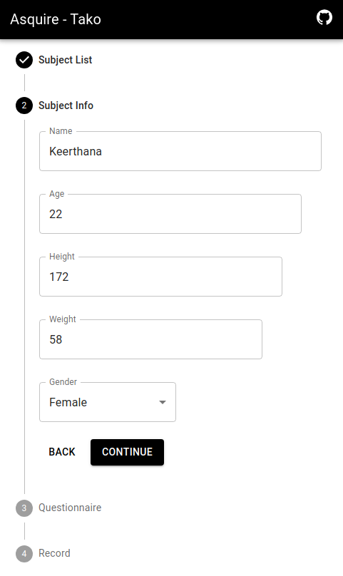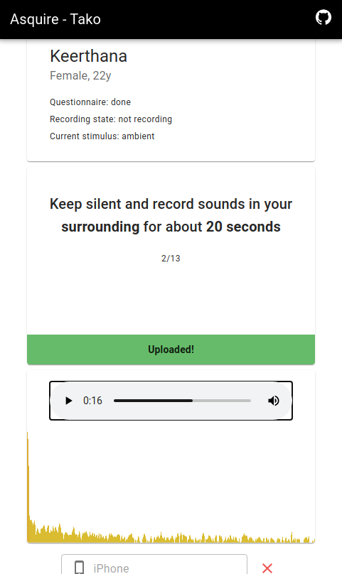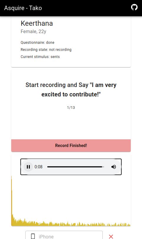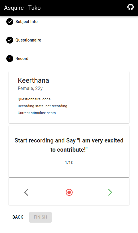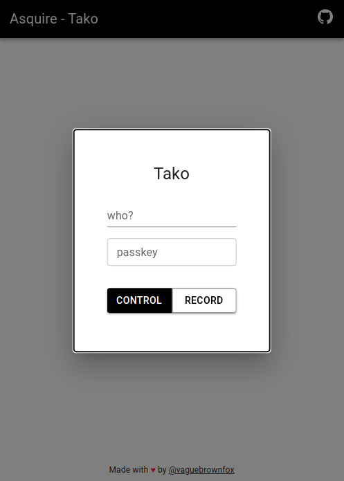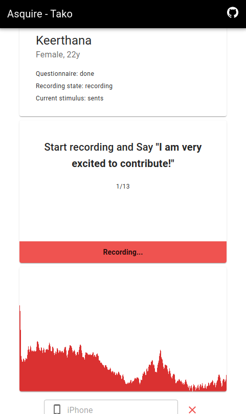 Asquire-tako is a web application designed as an extension to the Asquire data collection application. It allows for simultaneous recording of voice data from multiple devices, with one device acting as the head device and controlling the other devices. The recorded audio is then uploaded to the cloud using Firebase as the backend.