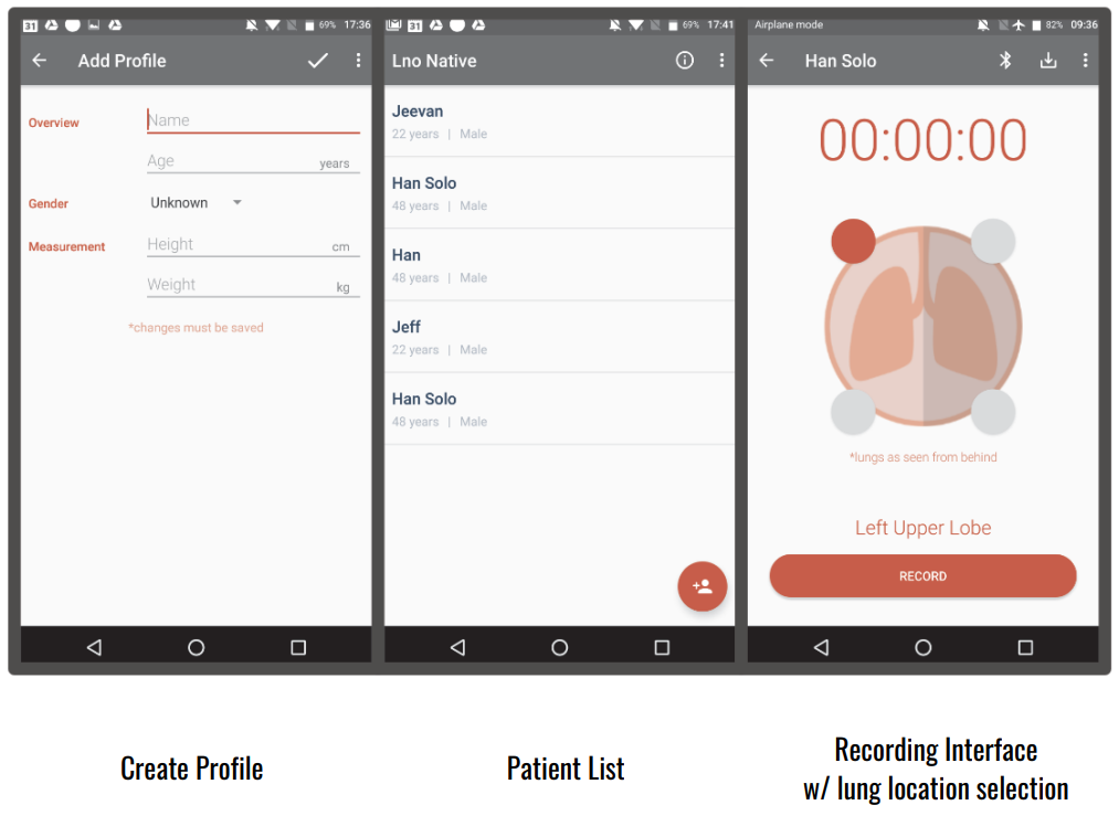 The smartphone app acts as an interface between the user and the Pnoi-phone hardware. The user, through the smartphone, can start/stop/pause the recording and collect and store the metadata of the patients.