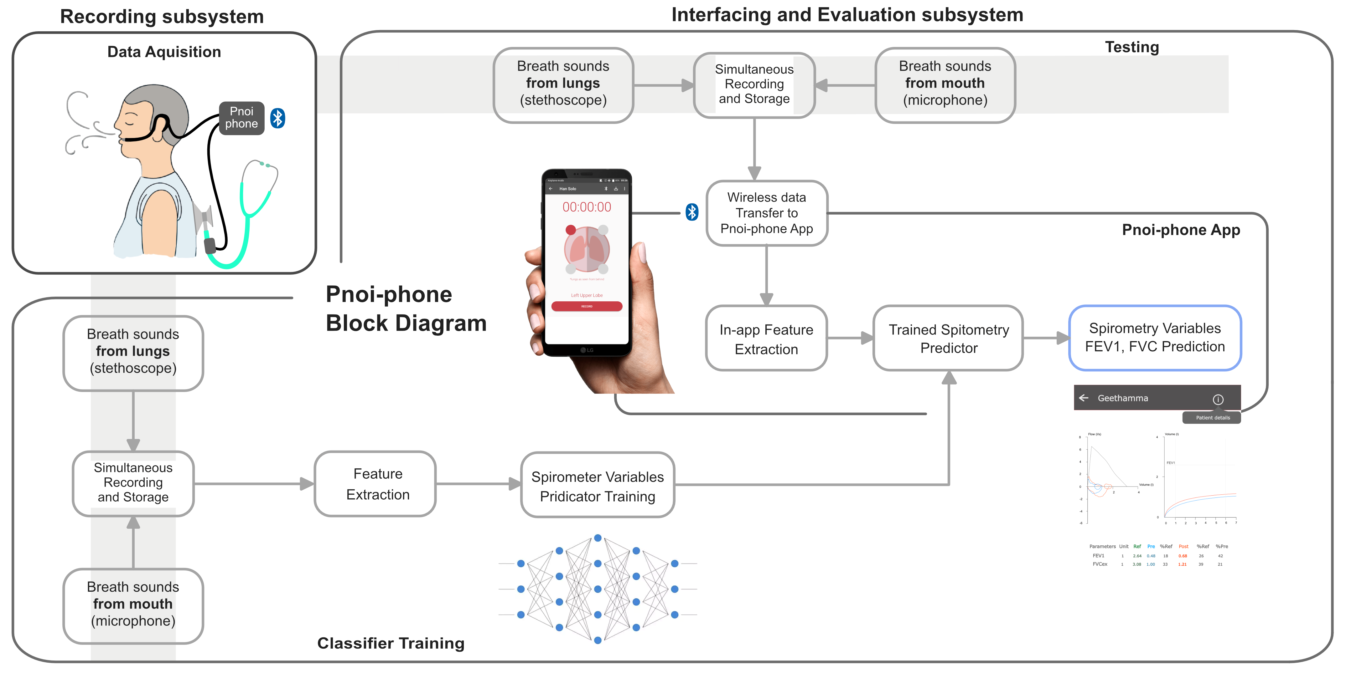 Pnoi-phone app is used to control various device functions such as recording and storing the data. The app is designed to be user-friendly and intuitive. It also provides a platform for the user to view the data and metadata collected by the device. It also integrates a trained Pnoi AI model to predict Pulmomnary Function Test (PFT) values and display them to the user.