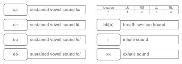 bb[n]: marks a single breathing session consisting of Five breaths recorded at a single location. n encodes the location of the recording.