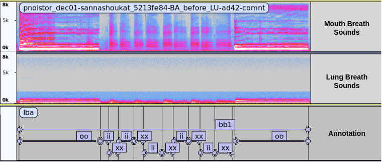 Fig. Spectrogram showing two channels breath audio annotated with respective labels.