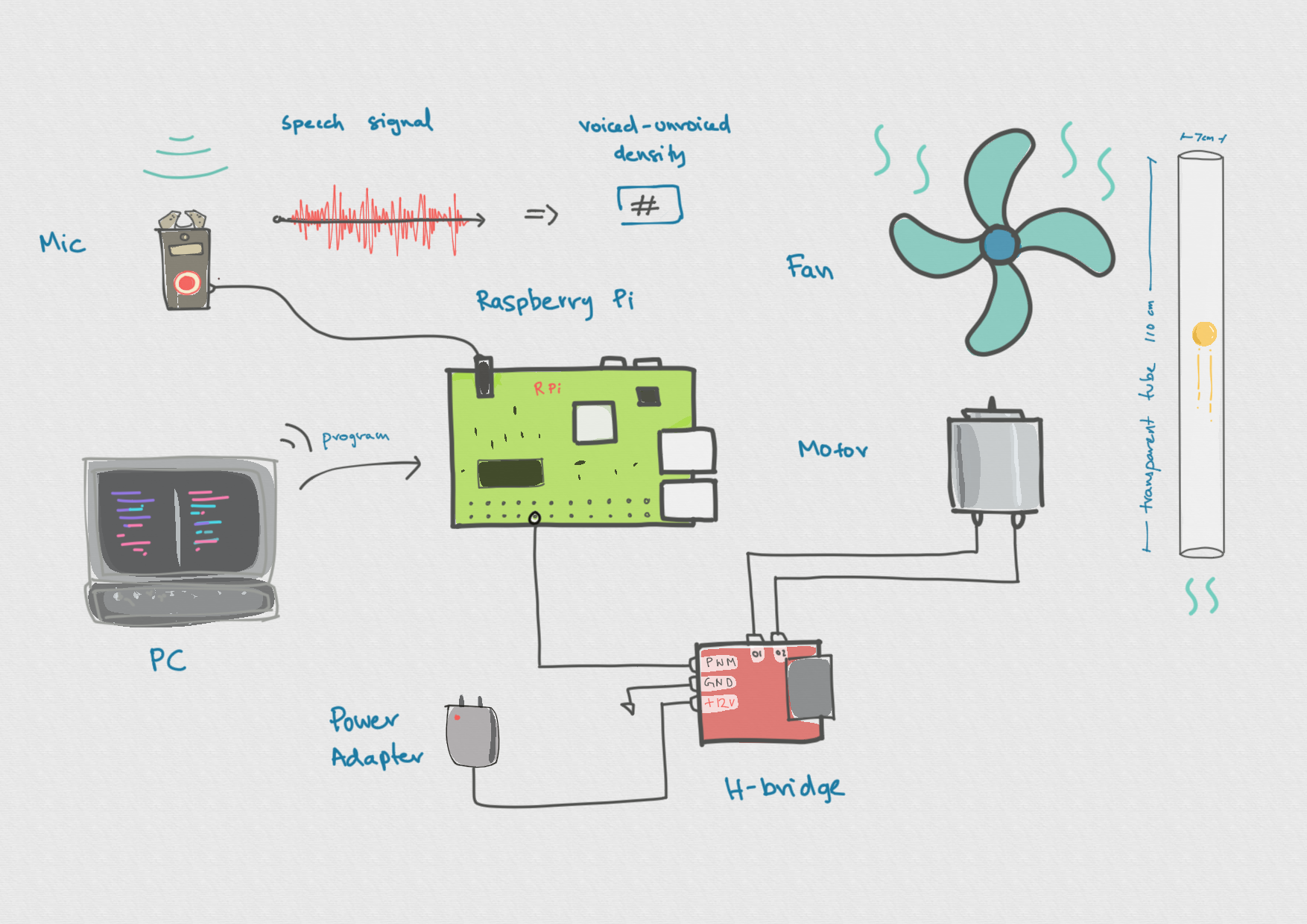 The player's speech is recorded by the microphone and analyzed in real-time using pitch-based signal processing code to determine the speaking rate. The algorithm calculates the density of voiced and unvoiced segments in the speech signal to estimate the speaking rate. Voiced segments are identified using autocorrelation to detect pitch in bandpass filtered speech signal. As the measured speaking rate increases, the RPi controls the motor driver using PWM signals to proportionally increase the speed of the DC motor.