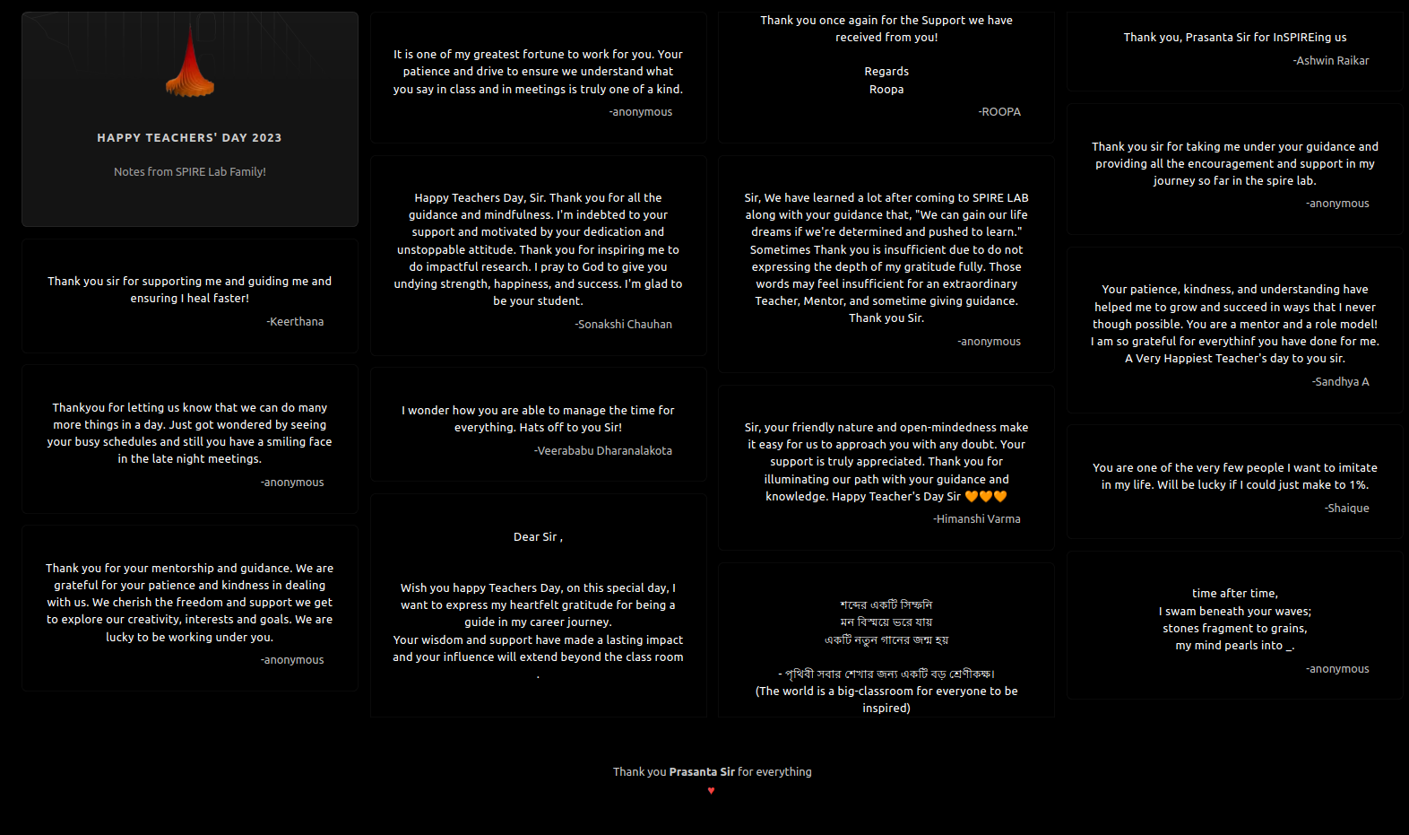 A few days before Teachers' Day, I reached out to all my labmates to contribute their messages and memories with professor. Everyone had heartwarming stories and words of appreciation to share, a few requested to be anonymous. I then built a simple webpage with all the messages mentorship, guidance, inspiration etc.